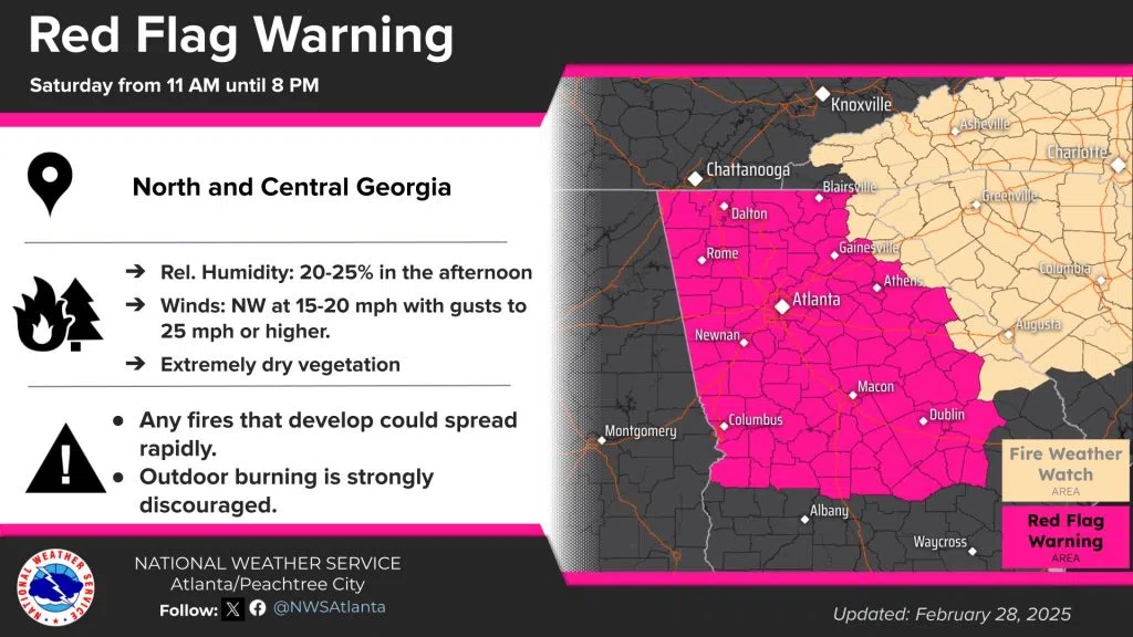 The National Weather Service in Peachtree City has upgraded the Fire Weather Watch to a Red Flag Warning for gusty winds, low relative humidities, and dry fuels, which is in effect from 11 AM to 8 PM EST Saturday.