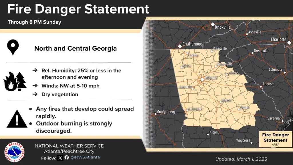 High fire danger conditions continue for Sunday afternoon and evening for all of north and central Georgia due to low humidities.