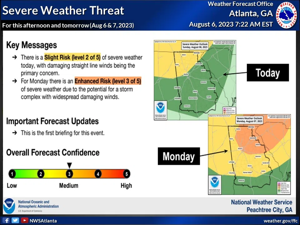 Sunday, August 6, 2023–2:52 p.m. -National Weather Service- Things are heating up for this afternoon and tomorrow. The risk for severe weather has increased with the latest data. Please keep your eyes on the sky as this forecast continues to evolve.