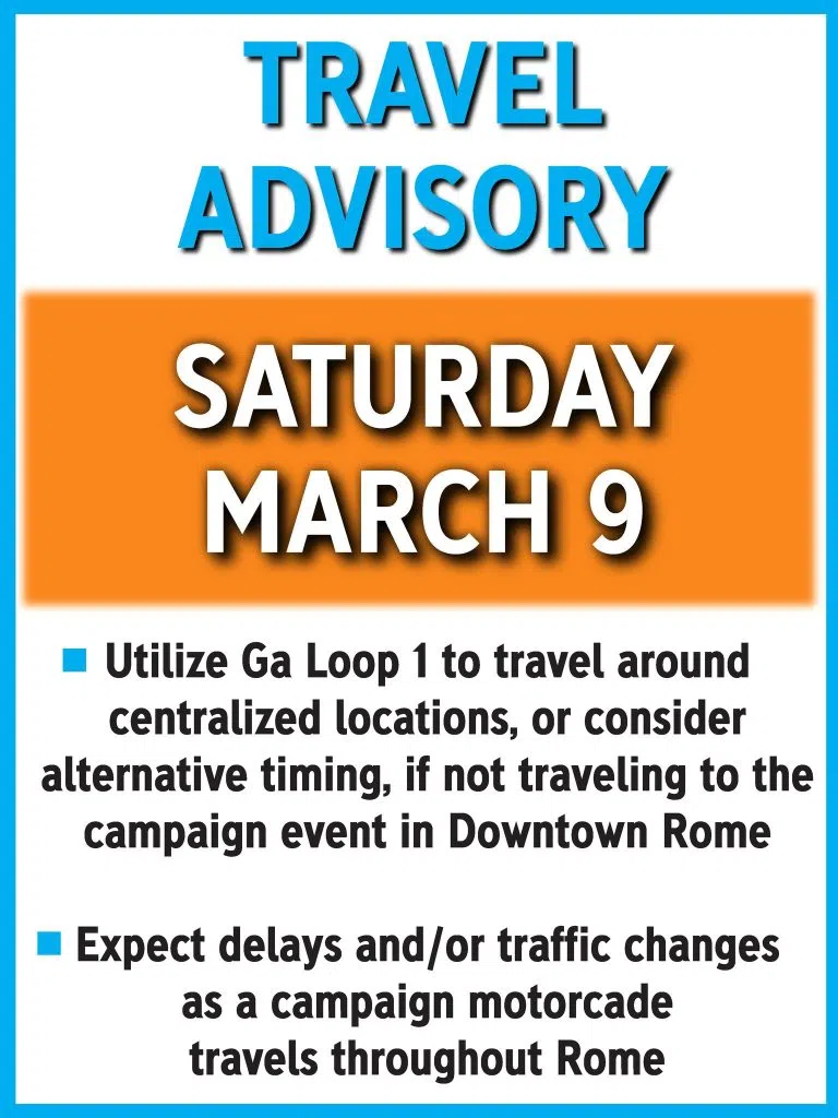 The following message was posted by the Rome Police Department on Wednesday afternoon regarding travel delay expectations due to the Trump Rally event on Saturday: