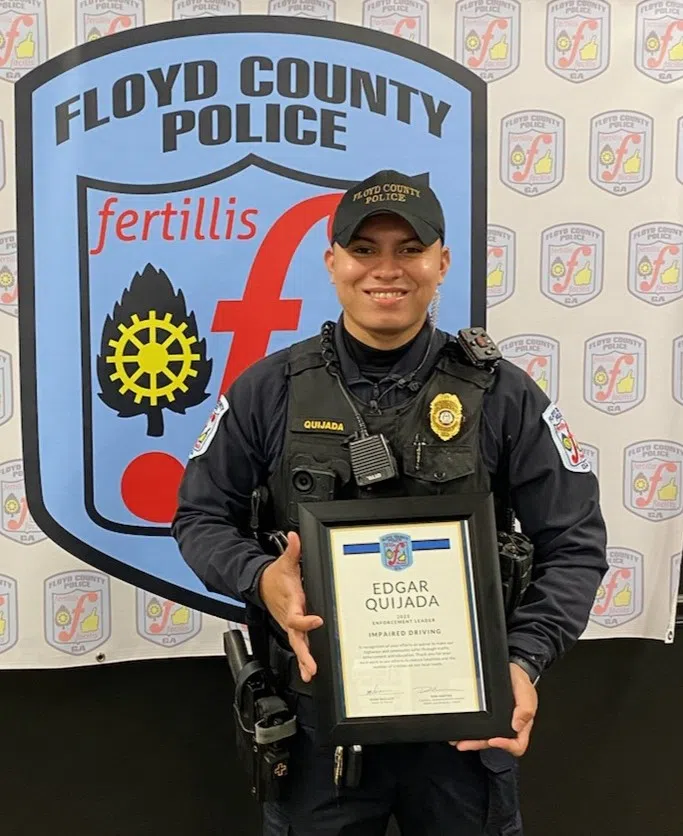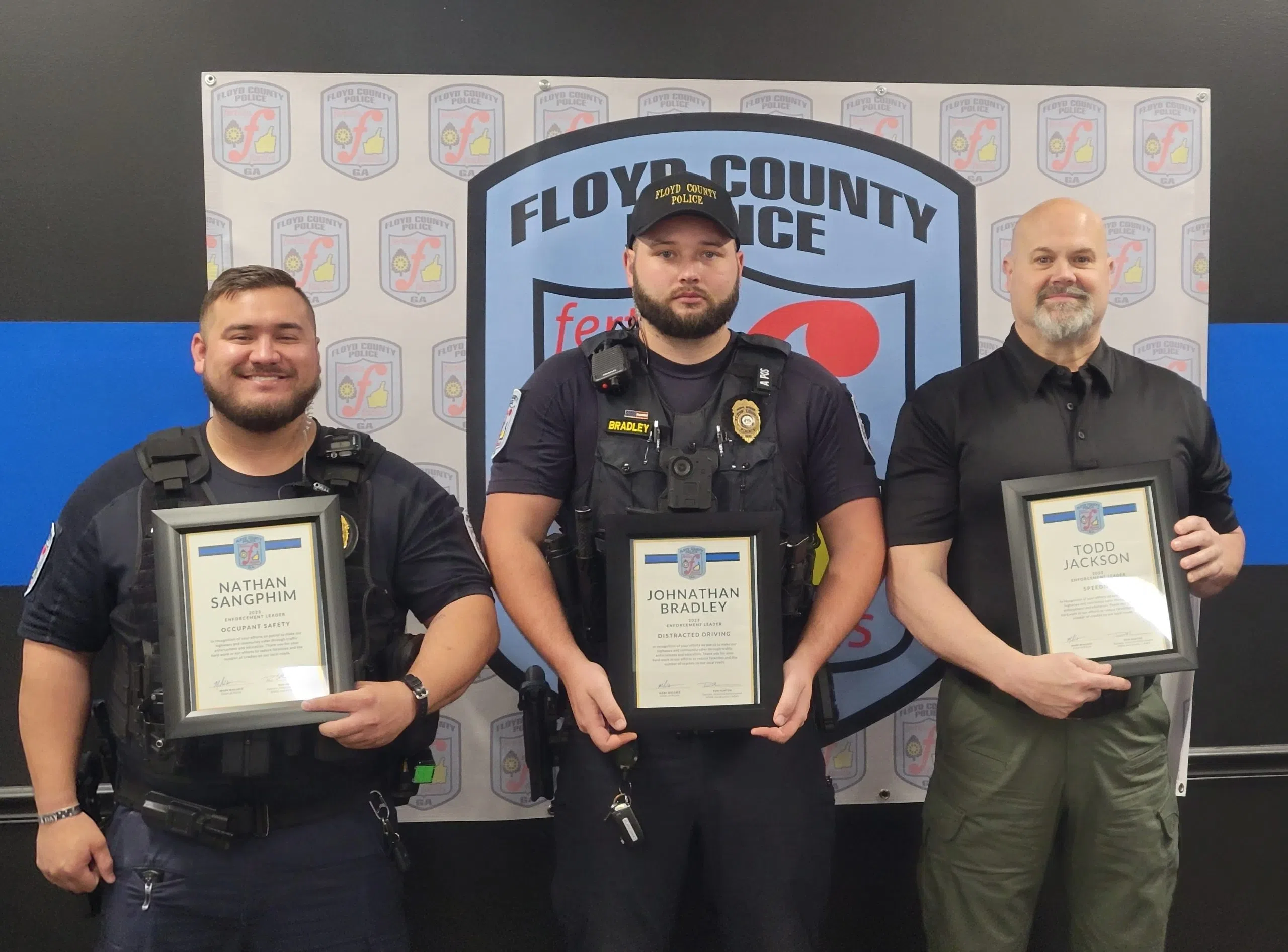The Floyd County Police Department recently recognized Officers Todd Jackson, Edgar Quijada, Johnathon Bradley, and Nathan Sangphim, for their work throughout the year in traffic safety and education, who helped with the goal of reducing the number of injuries and fatalities from automobile crashes in the community.