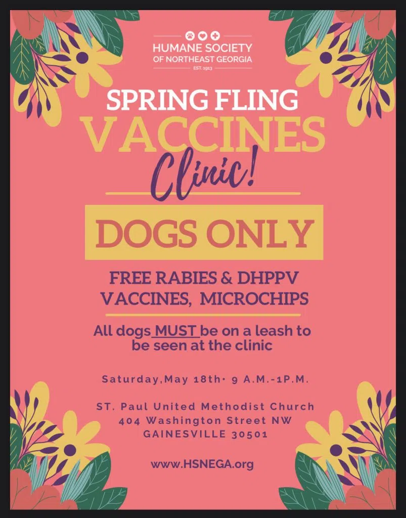 May 18 we will have a free dogs only vaccine clinic at St. Paul United Methodist Church in Gainesville, Ga.