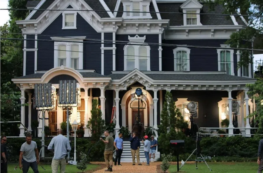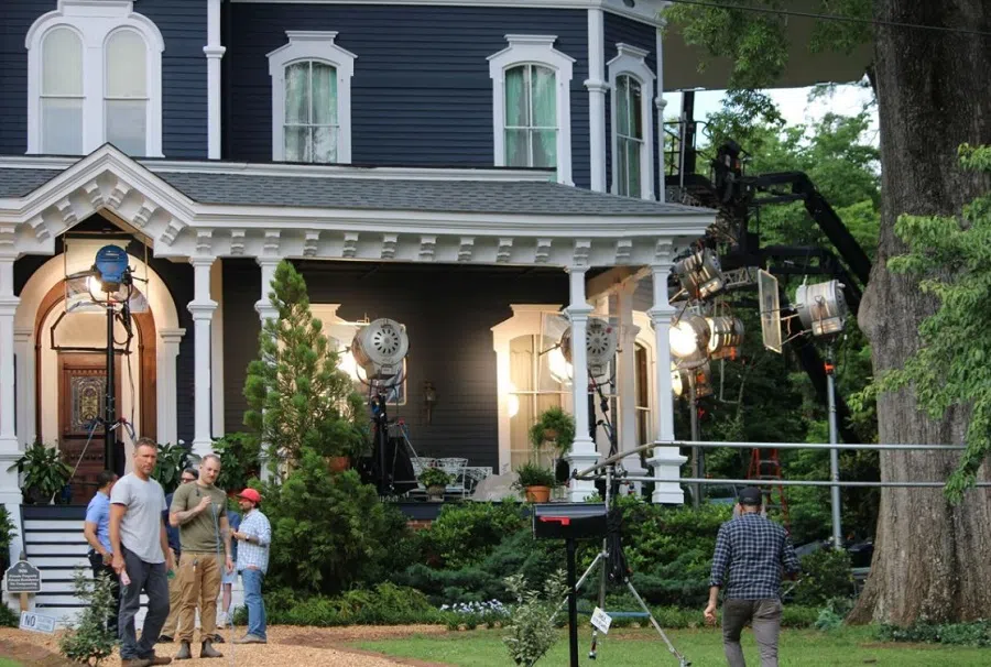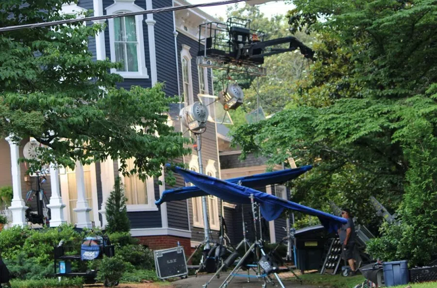 Massive lights sit on the front porch of The Claremont House on East Second Avenue. Crews will be filming there all week.