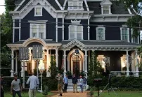Massive lights sit on the front porch of The Claremont House on East Second Avenue. Crews will be filming there all week.