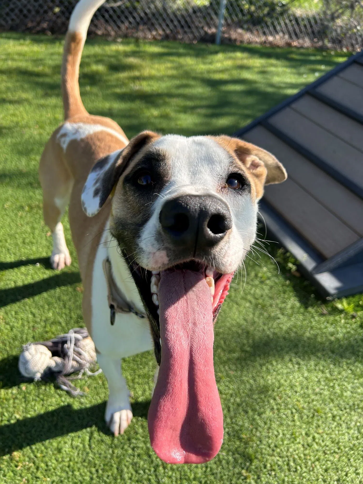 Catelyn is a very petite girl. She’s about the size of a beagle, weighing in at 30lb. She is sweet as sundrops and loves to spend time with people. Now that she’s got her girlish figure back, she is very anxious to get some exercise. She loves to run and would do best with an active home and a big fenced yard to let her zoom around. She will need to be supervised in the yard for a while as it seems she’s part kangaroo as well. This may lessen when she’s able to get her energy out more and she knows she’s home. She loves to play with toys and enjoys a good game of fetch.