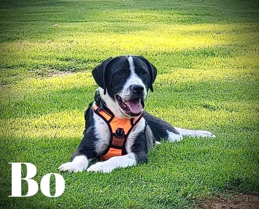 Hi im Bo!! I came from Bartow County Animal Shelter with my three brothers. They were pretty mean to me and didn’t let me eat much. I had a really bad skin infection and was very underweight. Despite all that, and the 100 baths I have taken since then, I have NEVER shown the first sign of aggression! BUT, look at me now! I’m a Great Pyrenees/Staffy mix so I will be a big boy!