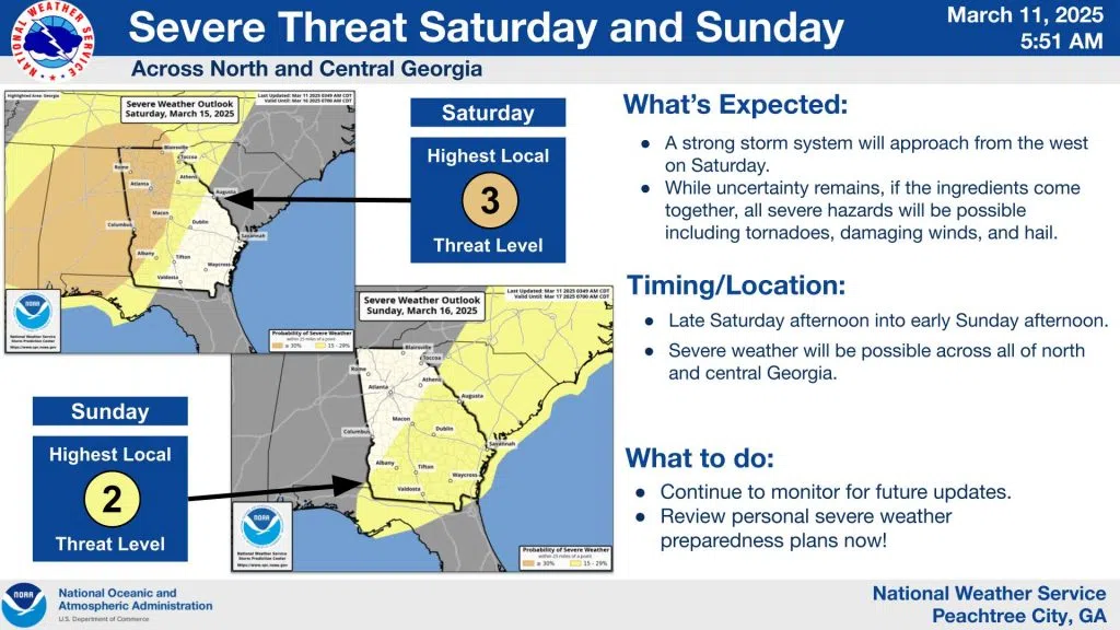 “The second wave has got potential, and that is Friday into Saturday,” he sai.d “However, what they are calling ‘the big show’ is going to be Saturday into Sunday. That is the one that has the most potential. We’ve already put a call out to our volunteers to let them know what’s happening and to ask them to be ready, trying to take some proactive stances so that we can help the fire department and to go out with them as they are responding. Instead of an engine company standing by at a power line, we can do that until Georgia Power comes.”