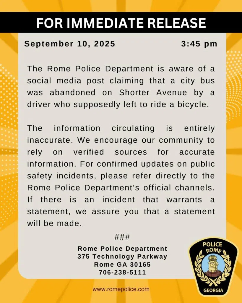 The Rome Police Department is clarifying a false claim circulating on social media regarding a city bus on Shorter Avenue.