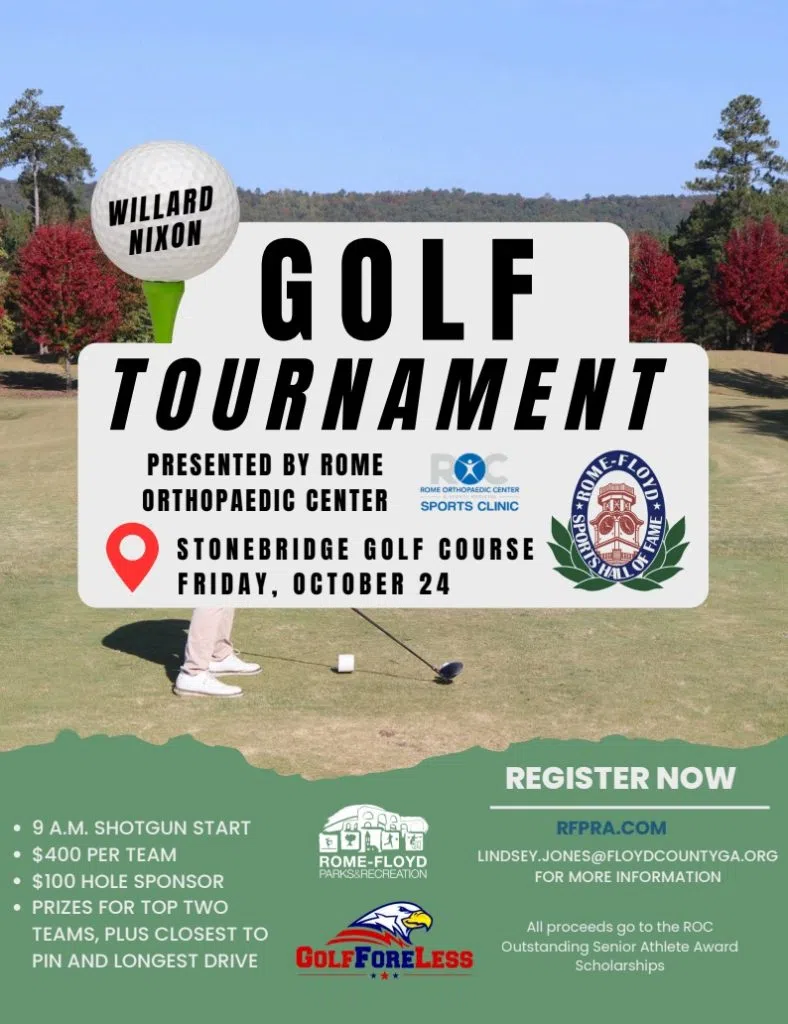 The Rome-Floyd Sports Hall of Fame is hosting its annual Willard Nixon Golf Tournament on Friday, October 24, at Stonebridge Golf Course in Rome. It is a 4-man scramble with a shotgun start at 9:00 a.m. Proceeds from the golf tournament will go to benefit local area high school senior athletes as well as the Rome-Floyd Sports Hall of Fame Banquet. Team registration is $400, and hole sponsorships are available for $100.
