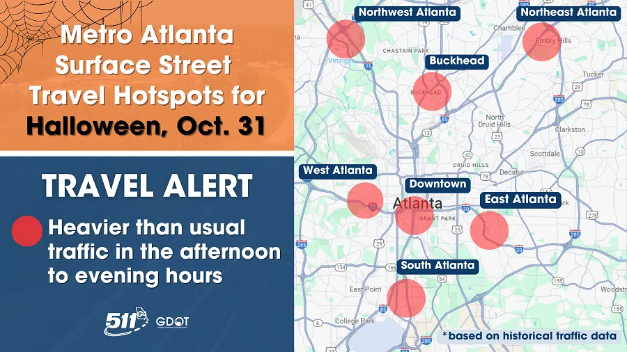 An increase in traffic due to Halloween festivities in Metro Atlanta is expected at the following locations: