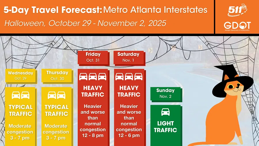 Halloween is this weekend, bringing many pedestrians to local neighborhoods for trick or treating and other Halloween festivities on Friday, October 31. The Georgia Department of Transportation (Georgia DOT) is sharing anticipated travel forecasts for interstates and surface streets from Wednesday, October 29, through Sunday, November 2, 2025, to help motorists plan their Halloween activities accordingly. The traffic volume data is based on evaluating historical Halloween traffic patterns.
