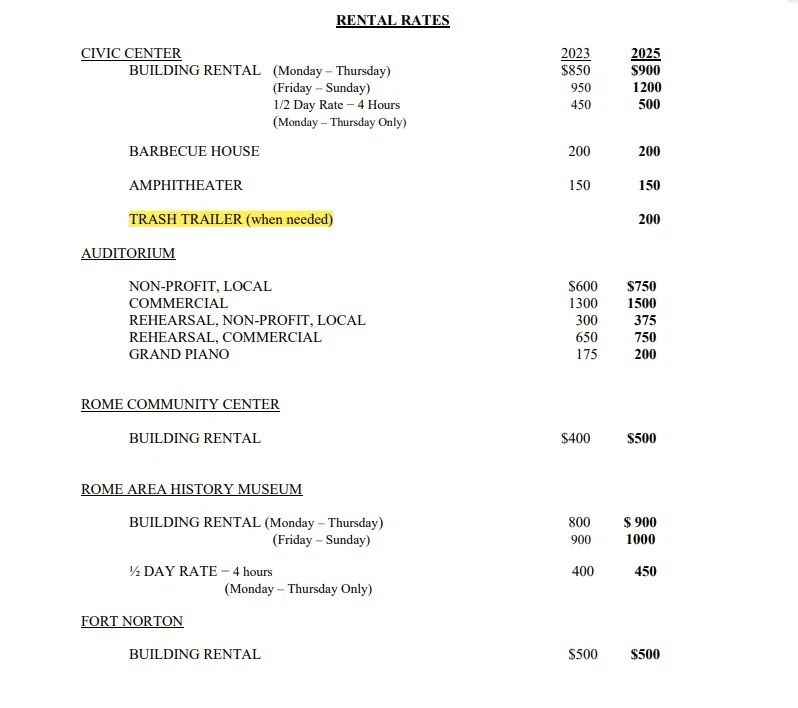 Commissioners also approved rental fees for the coming year for the civic center, city auditorium, community center, history museum, and Fort Norton.