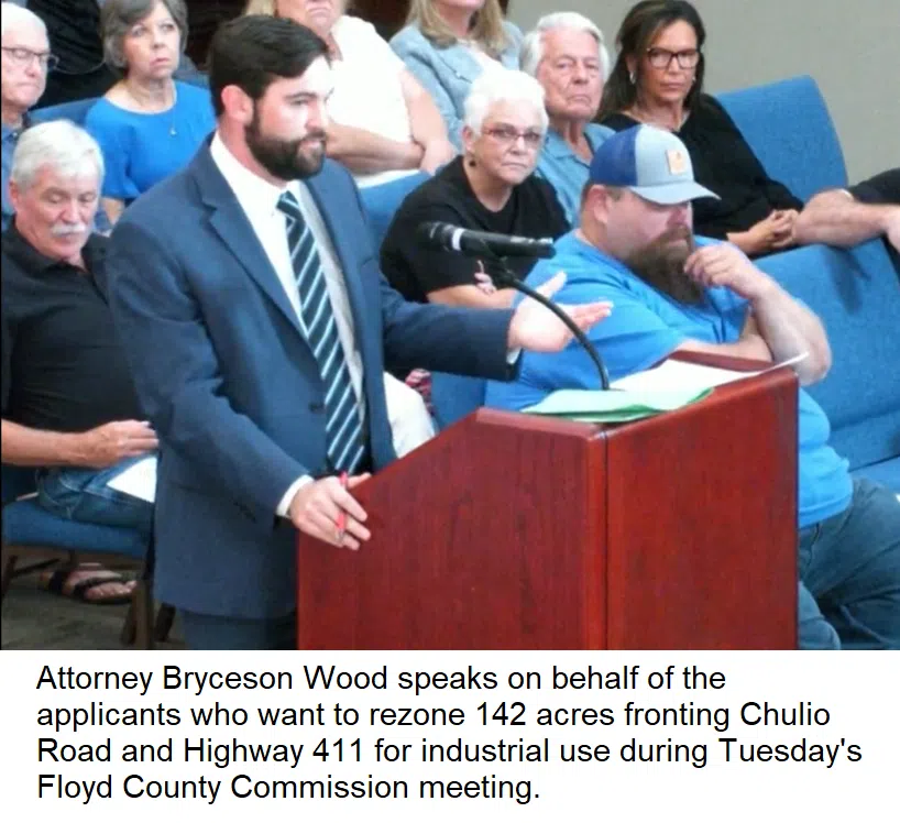 The applicant was seeking to rezone close to 124 acres fronting Chulio Road and Highway 411 from Suburban Residential and Multifamily Residential to Heavy Industrial to sell the property for industrial use.