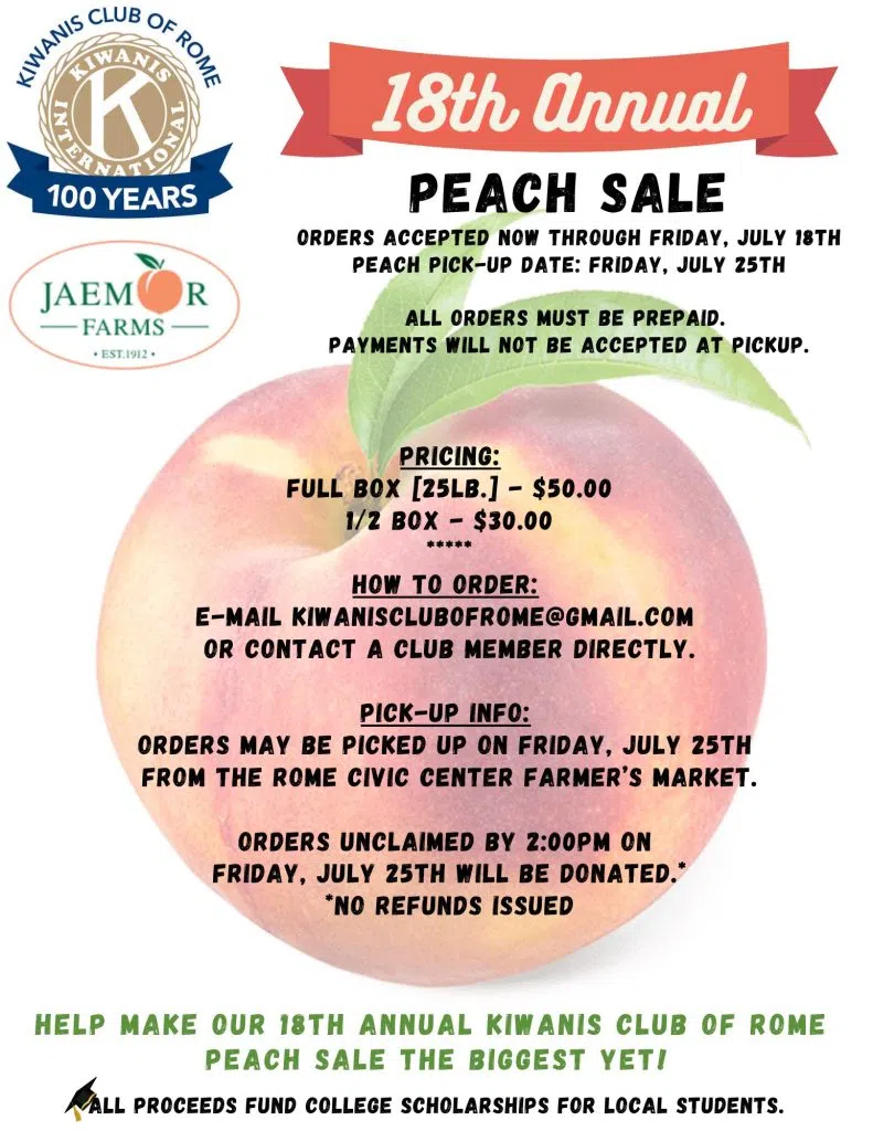 “This is one of our biggest markets of the year,” said Kristi Kent with the Georgia’s Rome Office of Tourism. “We are located across from Applebee’s and we are doing Peach Day with the Kiwanis Club. If you order them in advance—and a ton of people do—you can pick them up there in the parking lot of the Visitor’s Center. If you didn’t order them in advance, they should have some additional peaches on hand, but make sure you get there early.”