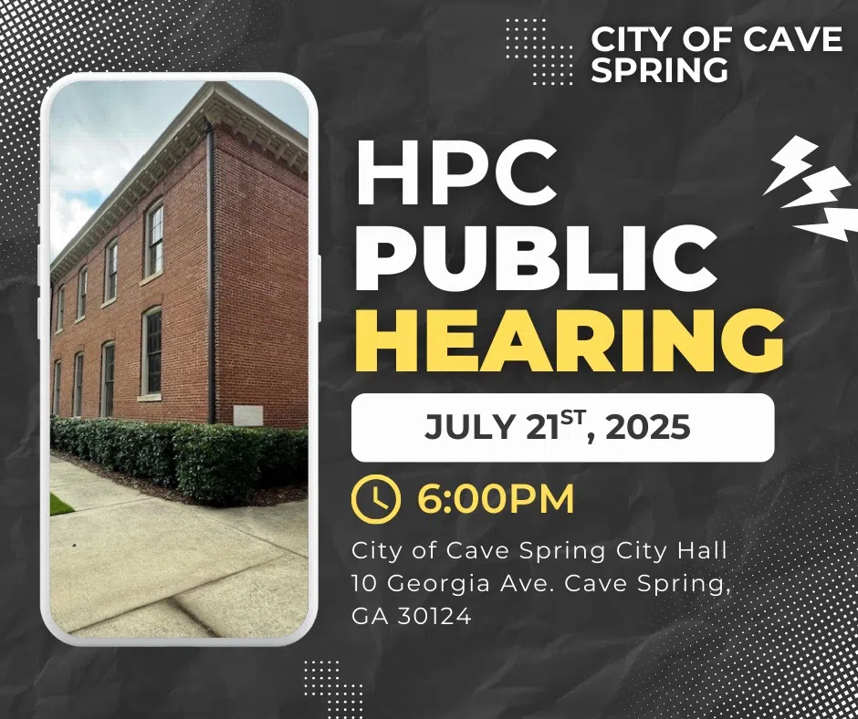 A public hearing for the HPC ordinance will be held, starting at 6 p.m., at Cave Spring City Hall.